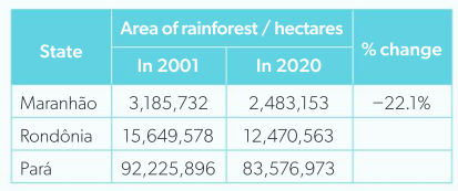 The table in the image shows the area of primary Amazon forest in three Brazilian states in 2001 and 2020. The calculation shows a significant percentage change in forest cover in Maranhão, highlighting the vulnerability of this ecosystem to deforestation.
